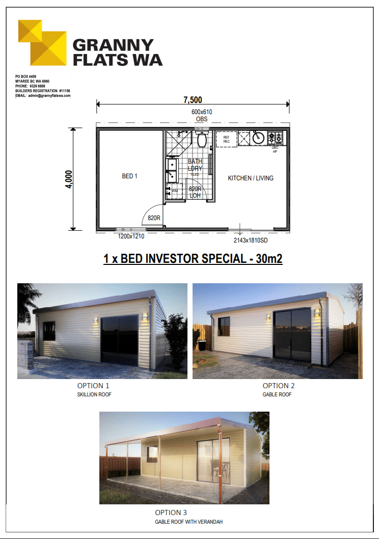 The one-bedroom granny flat floor plan is also known as the investor special. It is the most compact and cost-effective option amongst all of the available one-bedroom granny flats. It functions effectively as a rental property that appeals to students and retirees. It is 7500 mm in length and 4000 mm in width, giving it a slightly narrow shape. You can choose between a skillion roof, gable roof and a gable roof with verandah combo.Â